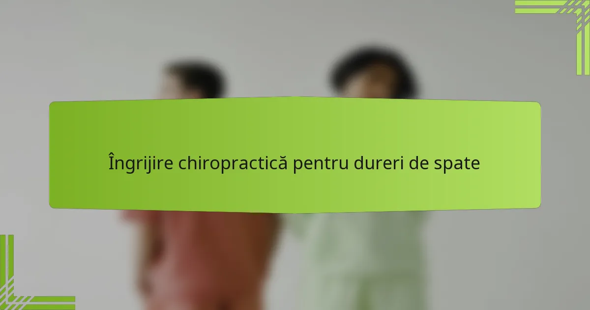 Îngrijirea chiropractică pentru durerea de spate pune accent pe diagnosticarea și tratarea tulburărilor musculo-scheletice, în principal prin manipularea spinală. Această abordare holistică își propune să alină durerea și să îmbunătățească funcționalitatea fără a se baza excesiv pe medicamente sau proceduri invazive, făcând-o o opțiune viabilă pentru multe persoane care suferă de dureri de spate.